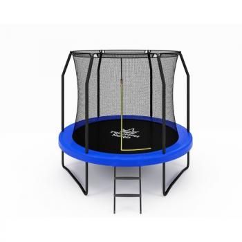 В комплекте двухступенчатая лестница. Цвет мата — черный, подушки безопасности и стойки — синий. Подушка безопасности находится снаружи защитной сетки. Ножки батута и вертикальные стойки, которые держат сетку, сделаны из оцинкованной стали. Мат — полипропилен, подушка безопасности сверху ПВХ, снизу нетканный материал, внутри — поролон, обмотка стоек — ПВХ, сетка — полиэтилен, верхнее кольцо — стекловолокно.