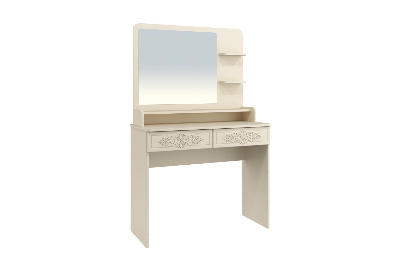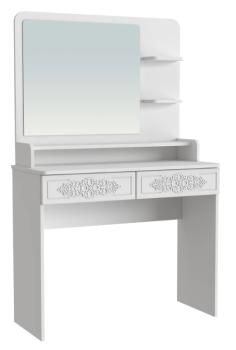 Туалетный столик ТСН-3 – неотъемлемая часть спальни или женской комнаты. Каждая девочка, девушка или дама хочет иметь собственное пространство, свой уголок красоты, для того чтобы привести себя в порядок, нанести макияж, удобно и компактно расставить свою косметику и парфюмерию, аккуратно сложить украшения и аксессуары. Столик имеет два выдвижных ящика на телескопических направляющих без доводчиков и зеркало с тремя полками. Размеры зеркала (ш/в) в мм: 630×550 мм. В оформлении фасадов МДФ применяется уникальная технология нанесения объемного узора (3D). Фурнитура: телескопические направляющие полного выдвижения.