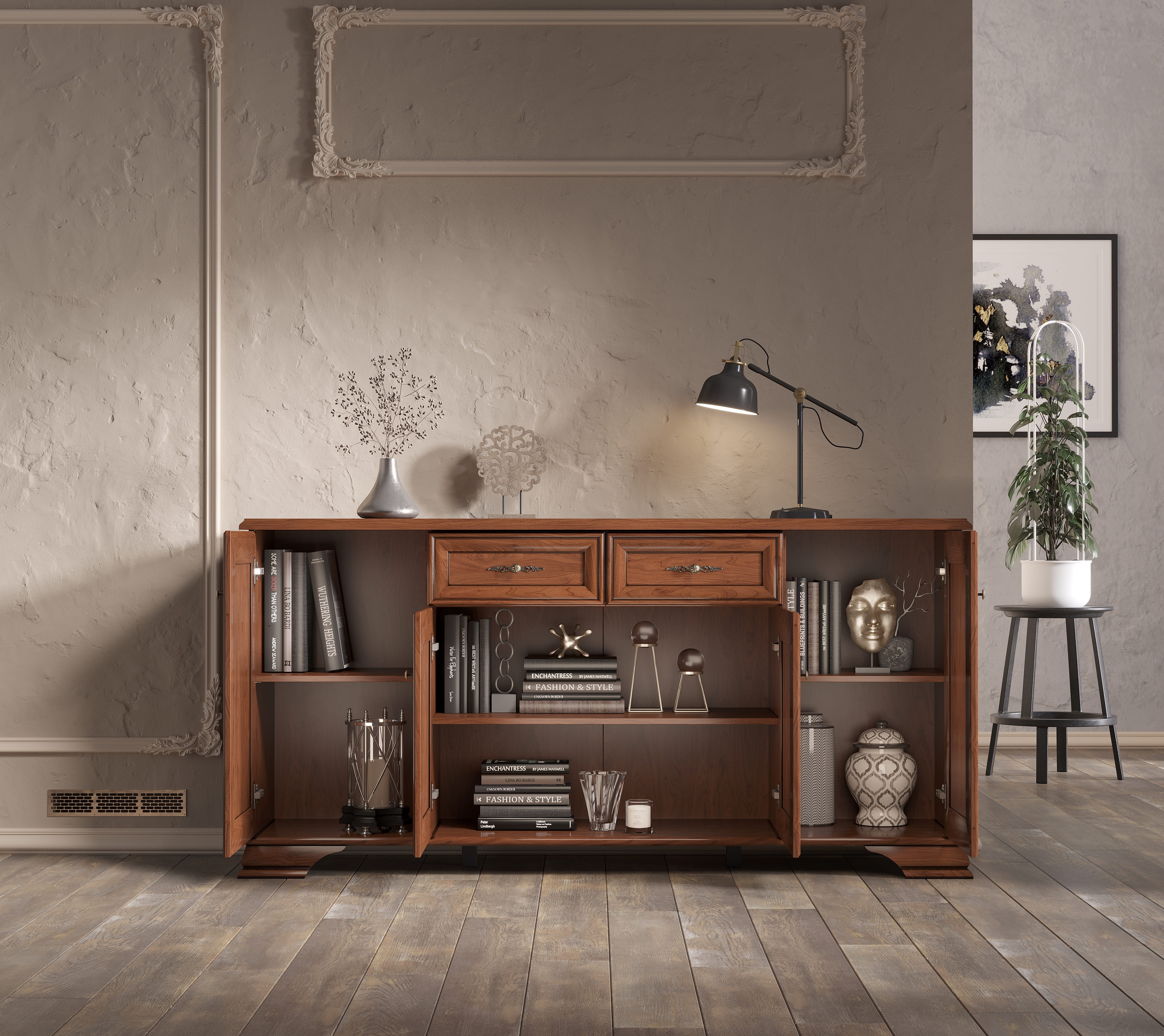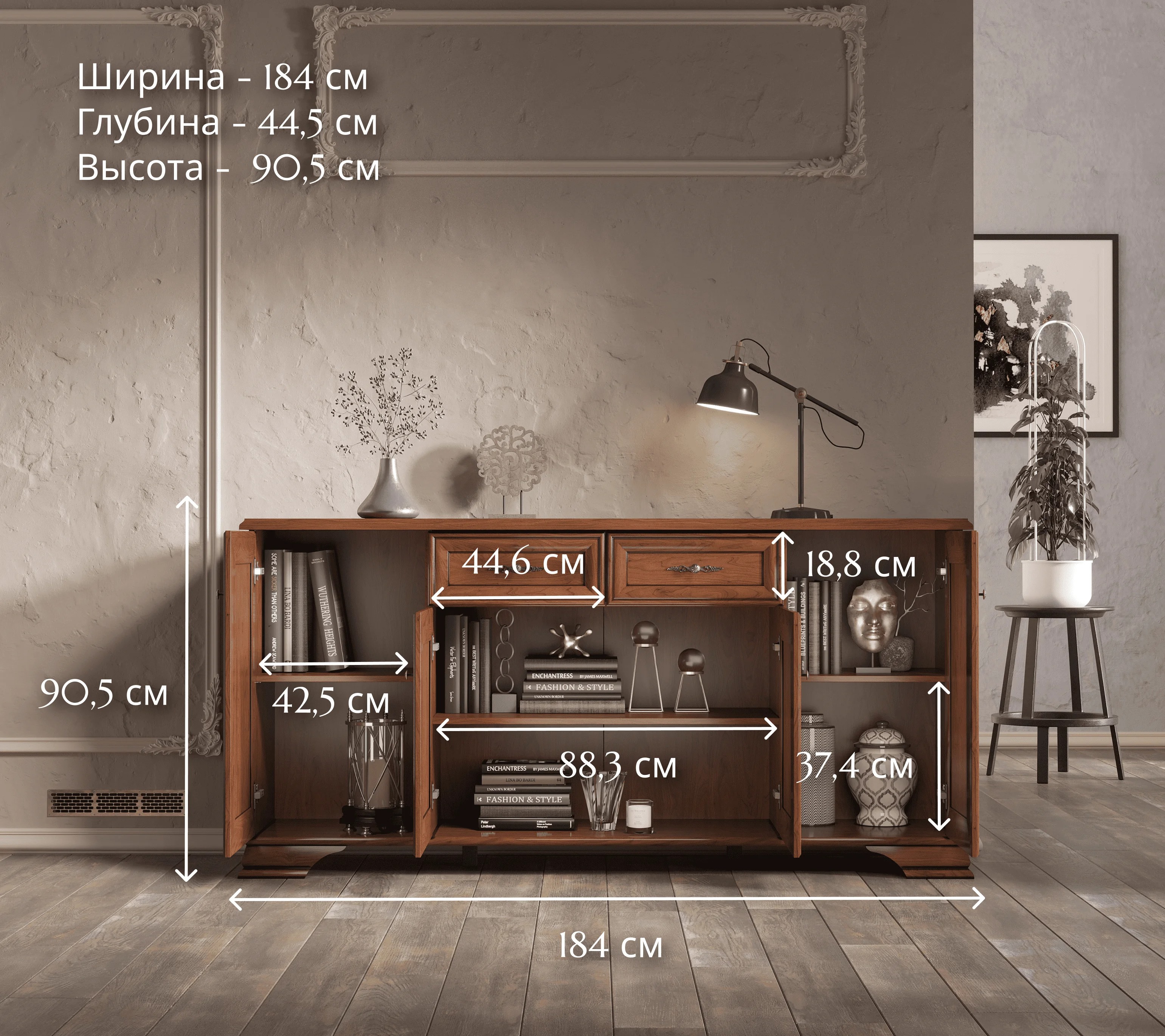 Внизу тумбы — прямоугольная ниша с горизонтальной съемной полкой. За боковыми дверцами — более высокие отделения, разделенные так же при помощи полки надвое.