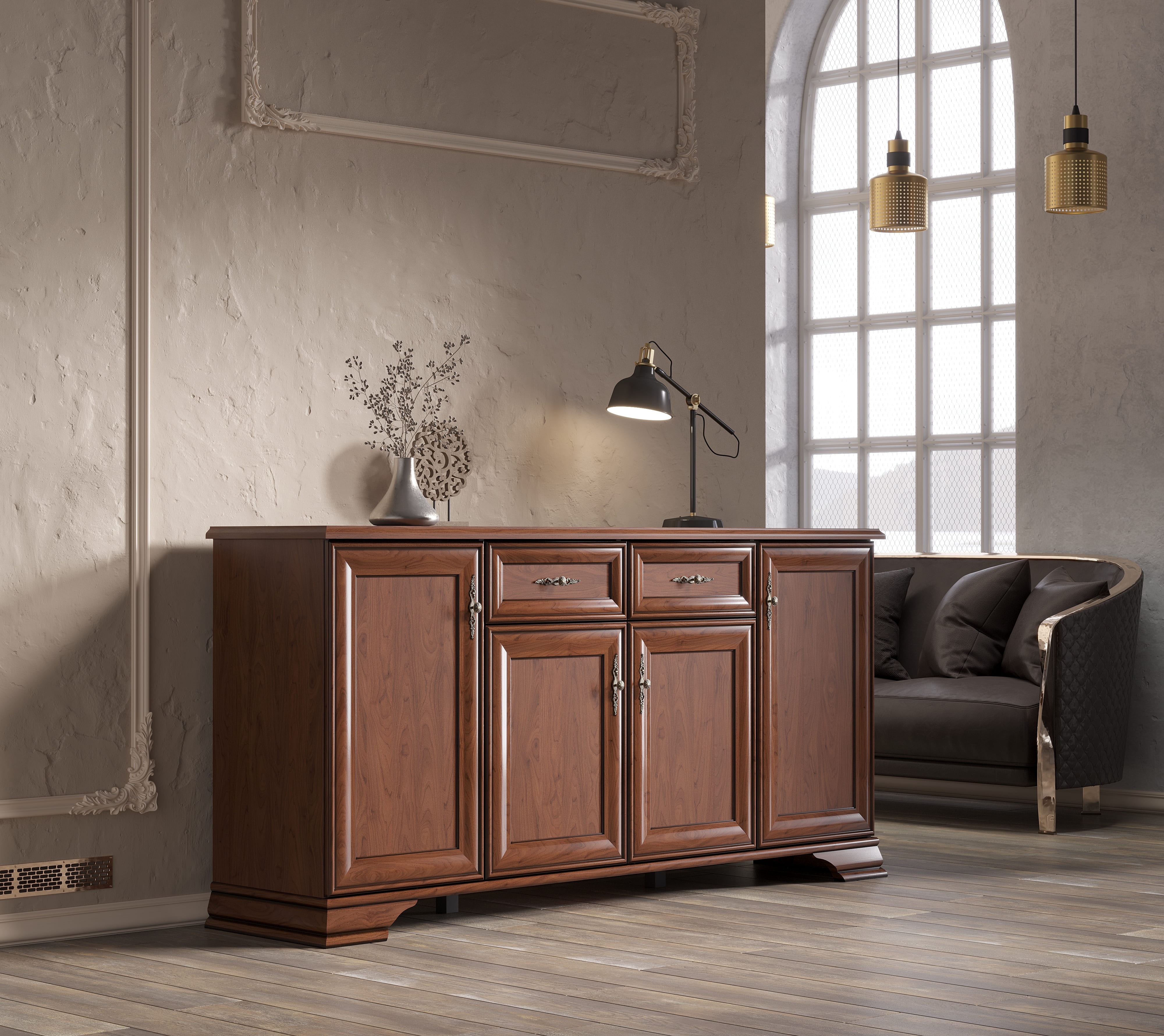 В коллекции Кентаки все фасады филенчатые, с эффектом патины. Состаривание делает мебель интересной и привлекательной (особенно в сочетании с резными ручками), а филенка значительно облегчает ее вес.