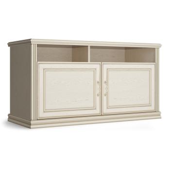 Интерьер любой гостиной предполагает установку ТВ тумбы. Такой предмет мебели помимо основной функции – размещение телевизора, позволяет хранить вещи и украшает пространство. В представленной модели вам доступно два вместительных отдела с дверцами и ниши, разделённые между собой перегородкой. Отделения с дверцами помогут закрыто хранить различные предметы, а в нишах вы можете расположить аппаратуру. Коллекция производится в светлой и нежной цветовой гамме из ЛДСП «Дуб Леонардо» и придется по вкусу любителям классики. Модуль смотрится очень изящно благодаря декоративному профилю, с эффектом золотого патинирования, ручкам цвета слоновой кости с золотом.