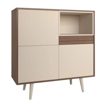 Современная тумба – комод 6-56019 с открытой полкой, 3-мя распашными дверцами и выдвижным ящиком. За дверцами скрыты полки , ящик на направляющих полного выдвижения. Механизм открывания и закрывания Push-to-Open – нажатием. Изделие установлено на высокие опоры.