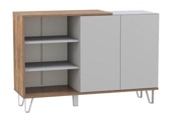 Тумба 58.05 из модульной системы «Гавана» с 3-мя открытыми полками и распашными дверцами с полкой за ними. Высокие опоры визуально неотличимы от металлических, но выполнены из пластика и не царапают напольное покрытие.