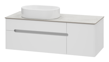 Столешница Misty Роял 120 выполнена из прочного керамогранита. Её строгая геометрия и матовая текстура придают комплекту лаконичность и утонченность. Конструкция столешницы адаптирована под установку различных типов накладных раковин, а также оснащена отверстием для смесителя, что делает монтаж быстрым и удобным.