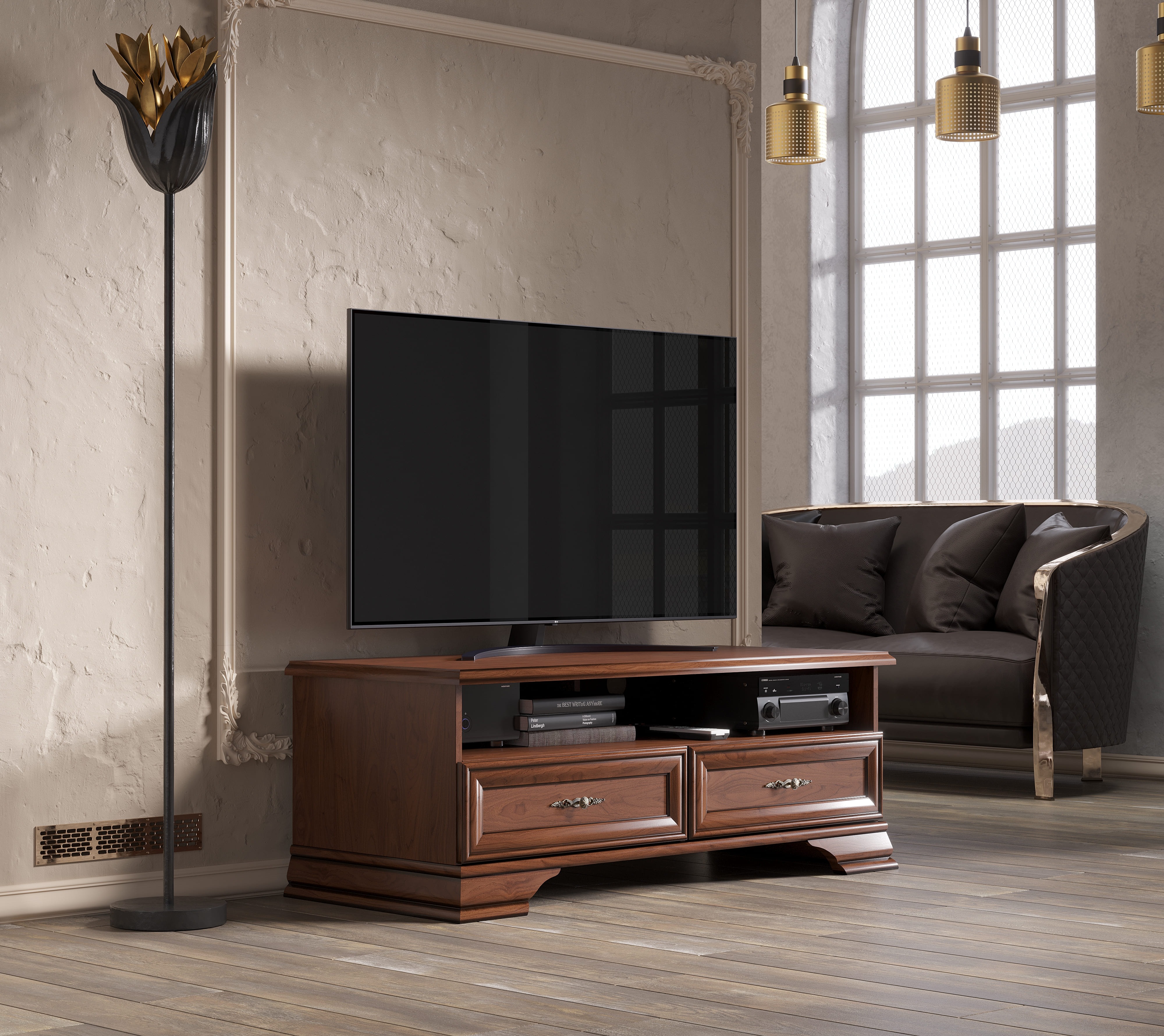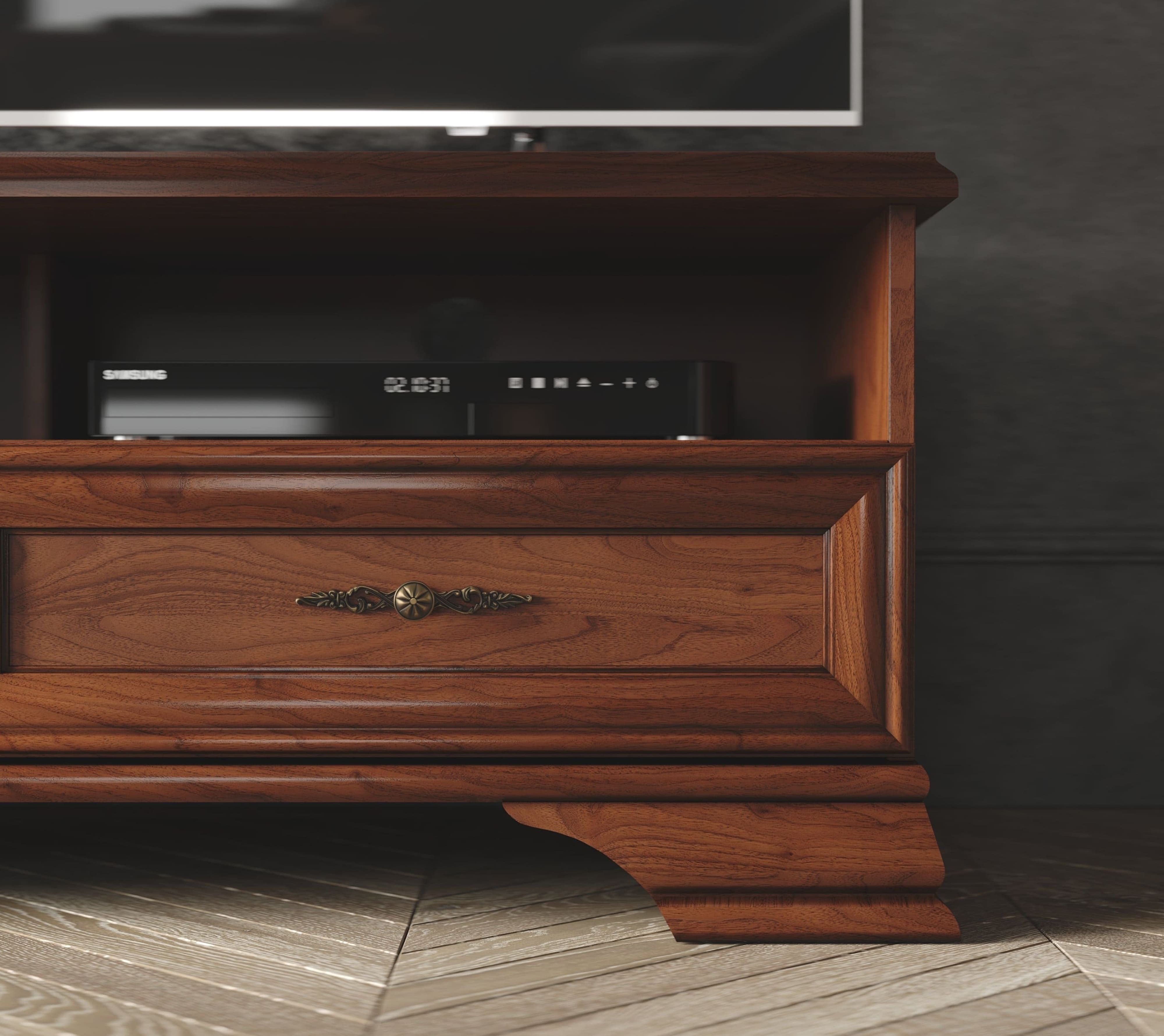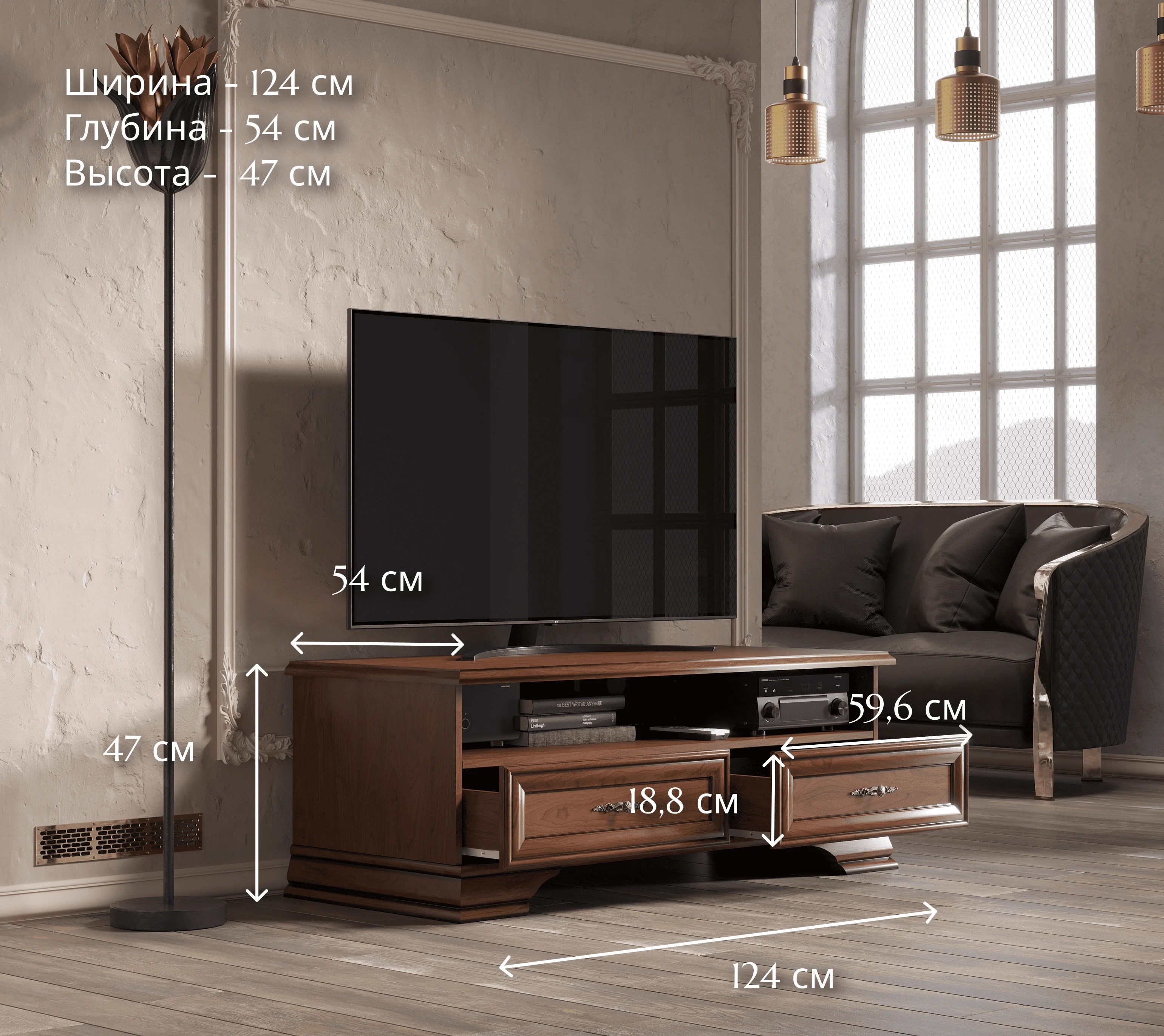 Длинная, невысокая (47 см), функциональная тумба под ТВ займет свое место в гостиной или спальне, сделав ее уютной и красивой. Углубления под аппаратуру имеют отверстия для проводов на задней стенке, чтобы вся композиция выглядела эстетично и привлекательно. В выдвижных ящиках удобно хранить сопутствующие аксессуары или журналы.