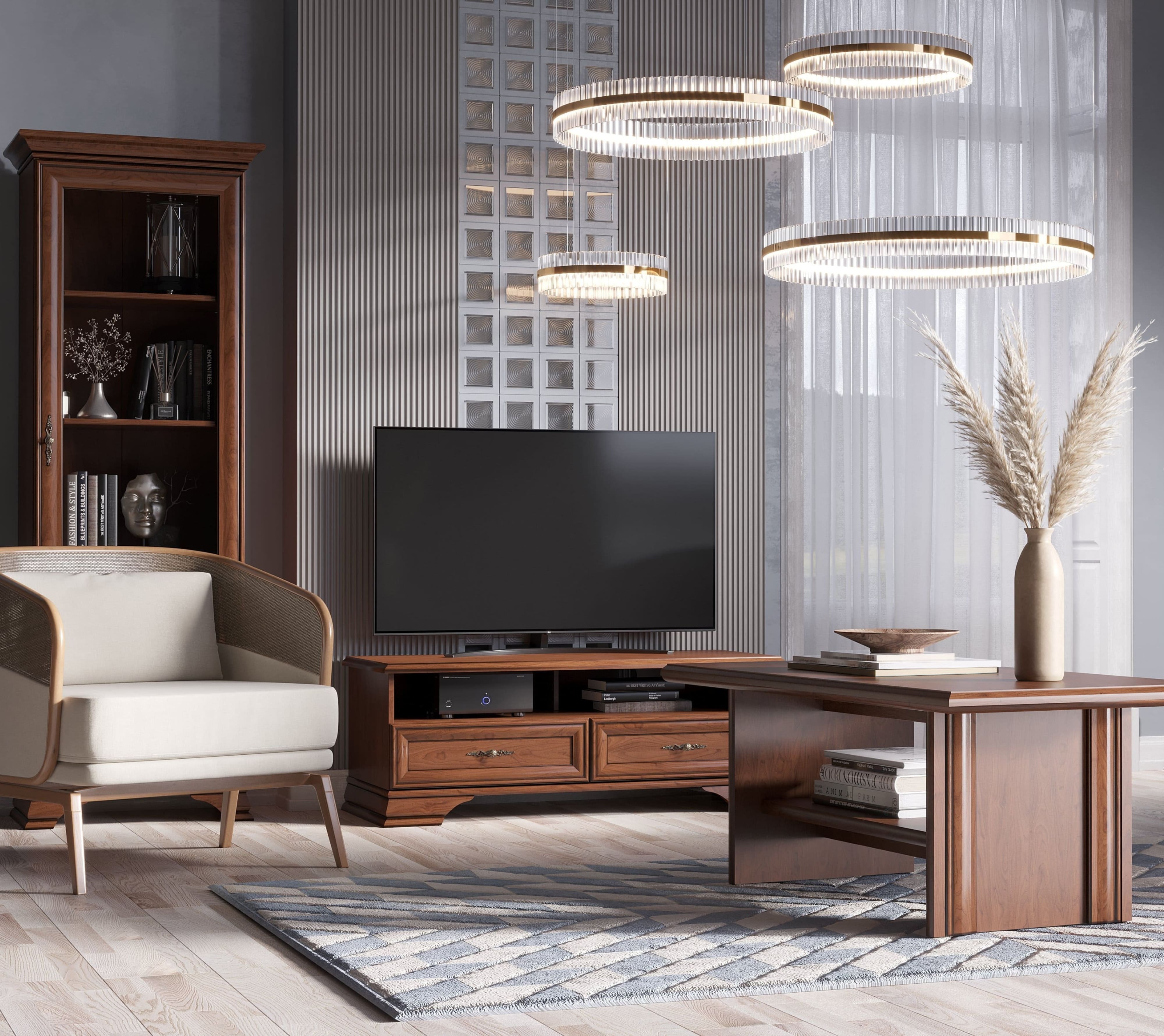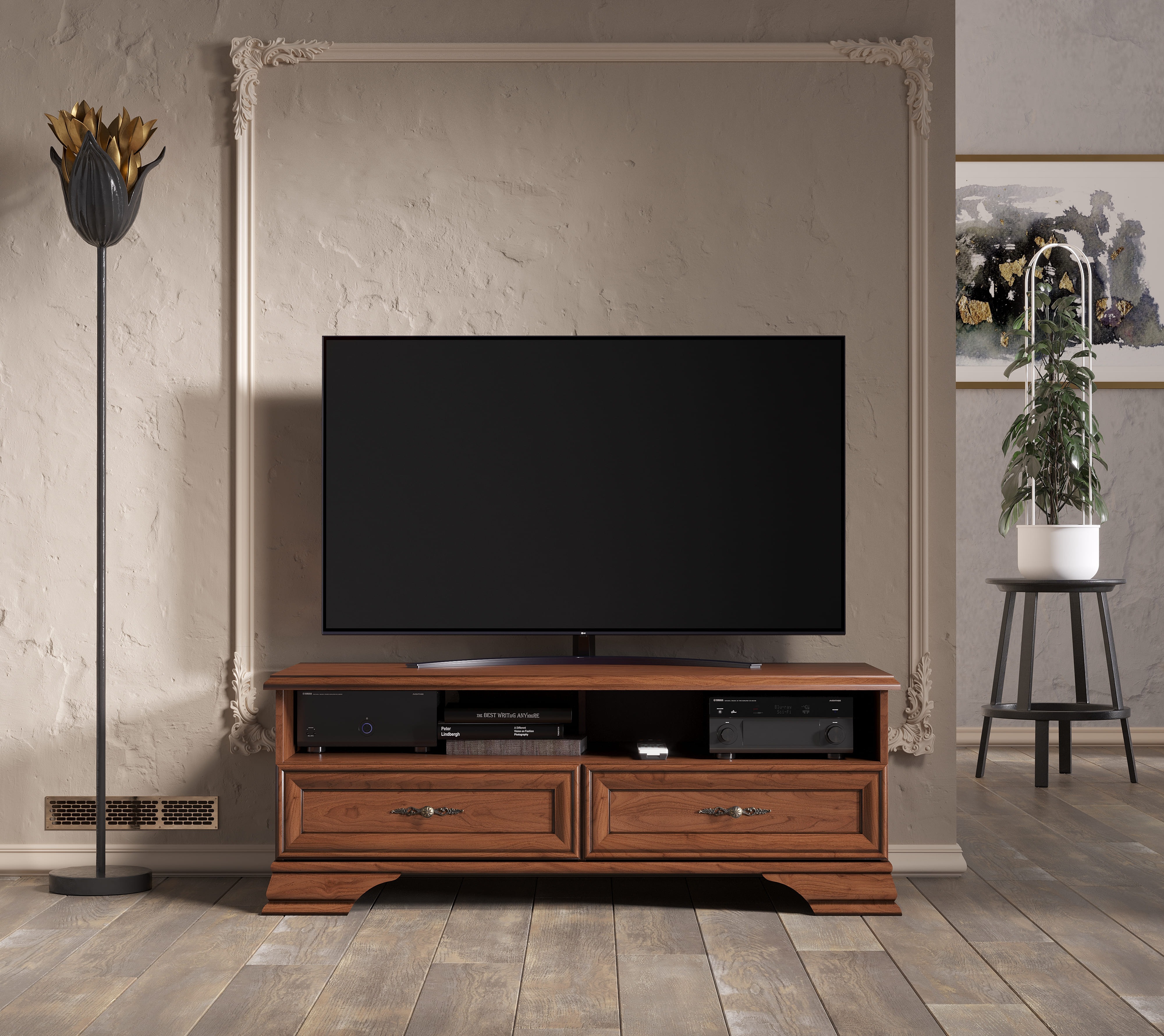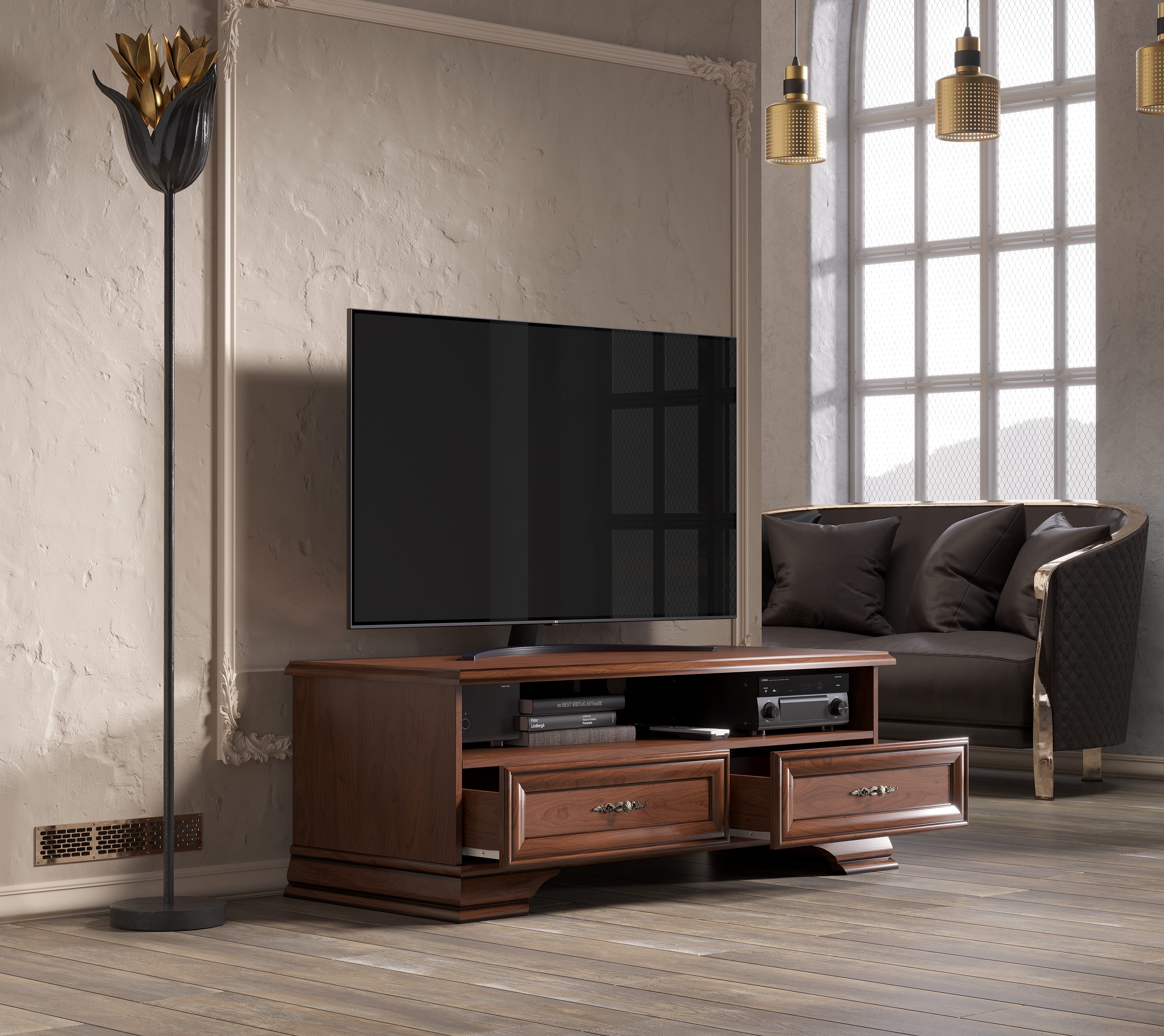 Длинная, невысокая (47 см), функциональная тумба под ТВ займет свое место в гостиной или спальне, сделав ее уютной и красивой. Углубления под аппаратуру имеют отверстия для проводов на задней стенке, чтобы вся композиция выглядела эстетично и привлекательно. В выдвижных ящиках удобно хранить сопутствующие аксессуары или журналы.