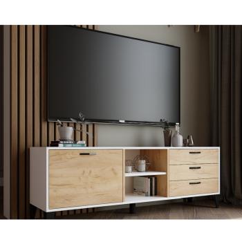 Тумба оснащена тремя выдвижными ящиками, открытыми нишами и полками за глухой створкой, что позволяет удобно разместить вещи, аксессуары и книги. Корпус выполнен из белого ЛДСП с тиснением «древесные поры», а фасад — из ЛДСП в цвете дуб крафт золотой.