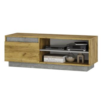 Модульная коллекция для гостиной Эмми выполнена в стиле лофт и отличается сочетанием трендового декора крафт с древесной текстурой и вставками с рисунком под бетон. Оригинальное конструктивное решение коллекции – отсутствие лицевой фурнитуры. Тумба под телевизор оснащена распашной створкой и открытой полкой.