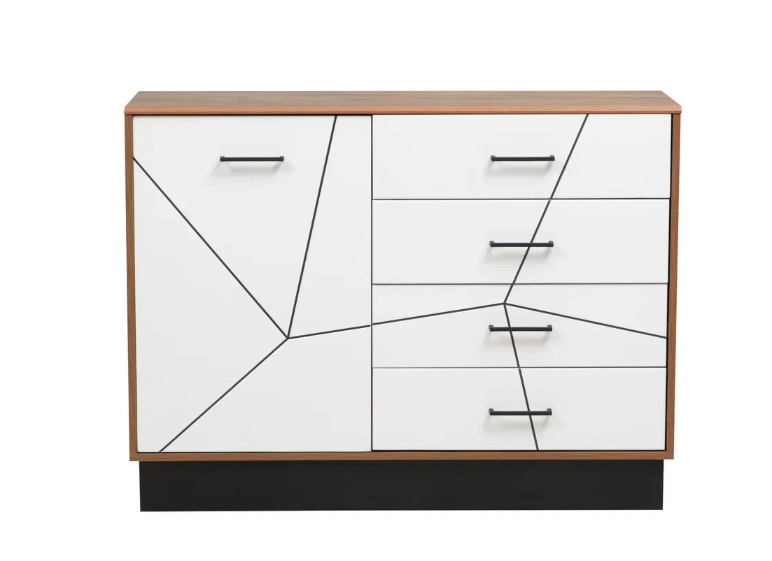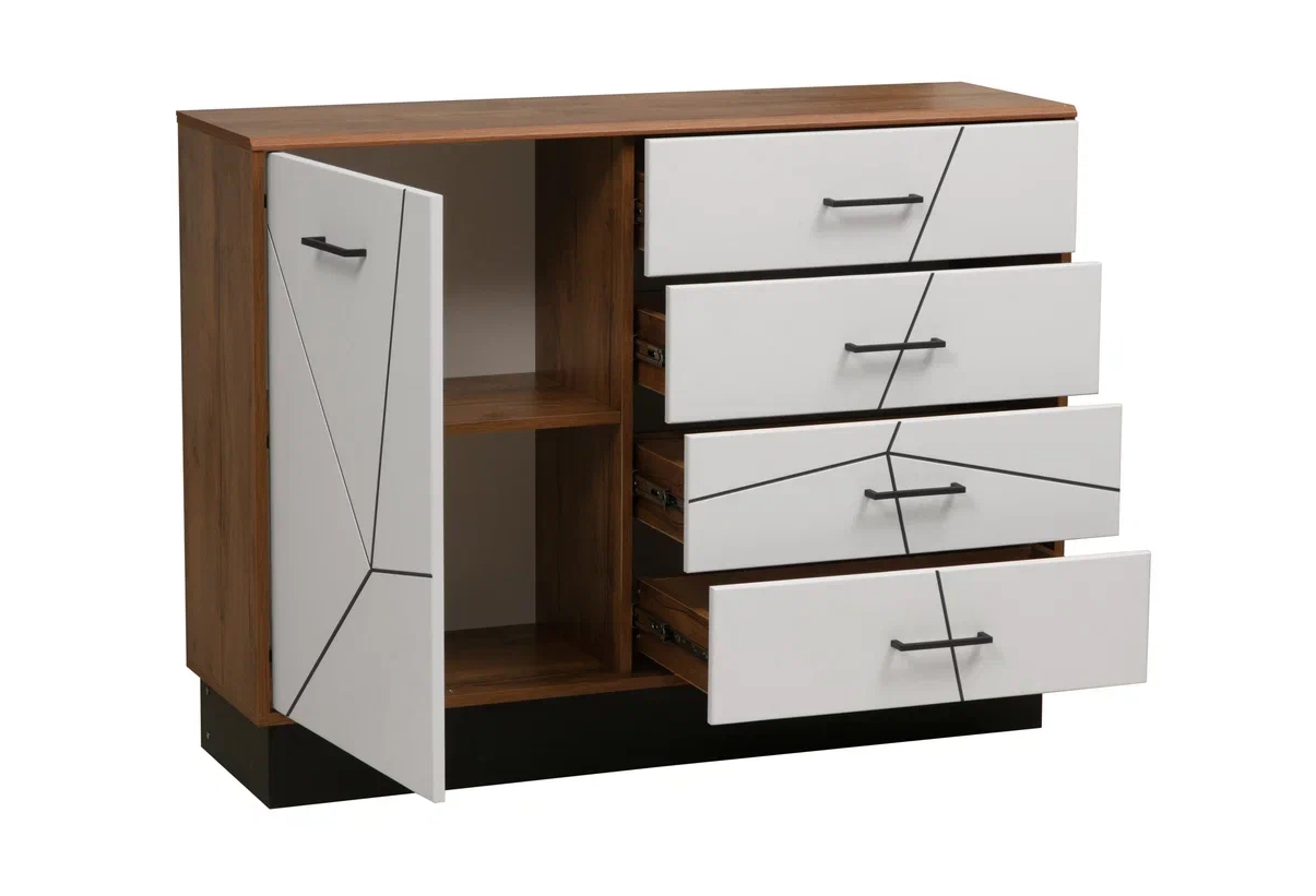 Большая тумба под ТВ из серии Гамма с открытой полкой, 2-мя выдвижными ящиками и 2-мя распашными дверцами.