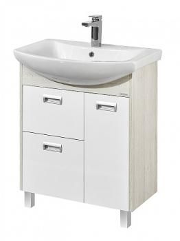 У тумбы размера 70 см слева расположены два ящика полного выдвижения, а справа – фасад-створка, петли с доводчиками. В комплект входит регулируемая по высоте полка. Тумбы установлены на металлические ножки и укомплектованы практичными врезными ручками, которые очень удобны в использовании. Боковые стенки и фигурная планка под раковиной изготовлены из ламинированной, текстурированной влагостойкой ЛДСП в цвете дуб сомерсет, а фасады – из крашеной в белый цвет влагостойкой ЛДСП.