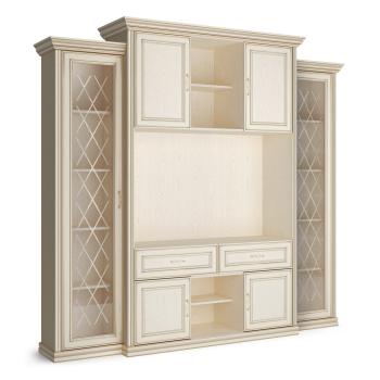 В его конструкции предусмотрены элементы ТВ тумбы, ниша над которой вместит телевизор с большой диагональю до 42 дюймов. В центральной части модуля расположены ящики и отделения с дверками для хранения всевозможных предметов, книг и мелочей. Открытые ниши облегчают конструкцию, в них можно установить декоративные статуэтки и рамочки с семейными фото. По бокам расположены две витрины, закрытые стеклодверями с прозрачным стеклом, на котором нанесен орнамент ромбы.