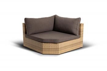 “Сан-Марино” угловой модуль дивана, алюминиевый каркас, искусственный ротанг, плоское плетение, цвет соломенный, размер 1120х1120х620. В комплекте с подушками серого цвета со съемными чехлами.