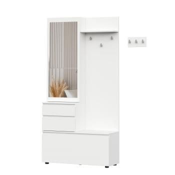 Вешалка Герда выполняет весь необходимый функционал в прихожей. Модуль содержит в себе двухсекционную обувницу для хранения обуви разной высоты, два выкатных ящика для аксессуаров и различных мелочей, декорированный зеркальной створкой пенал. Хранить верхнюю одежду удобно на открытых хромированных крючках.