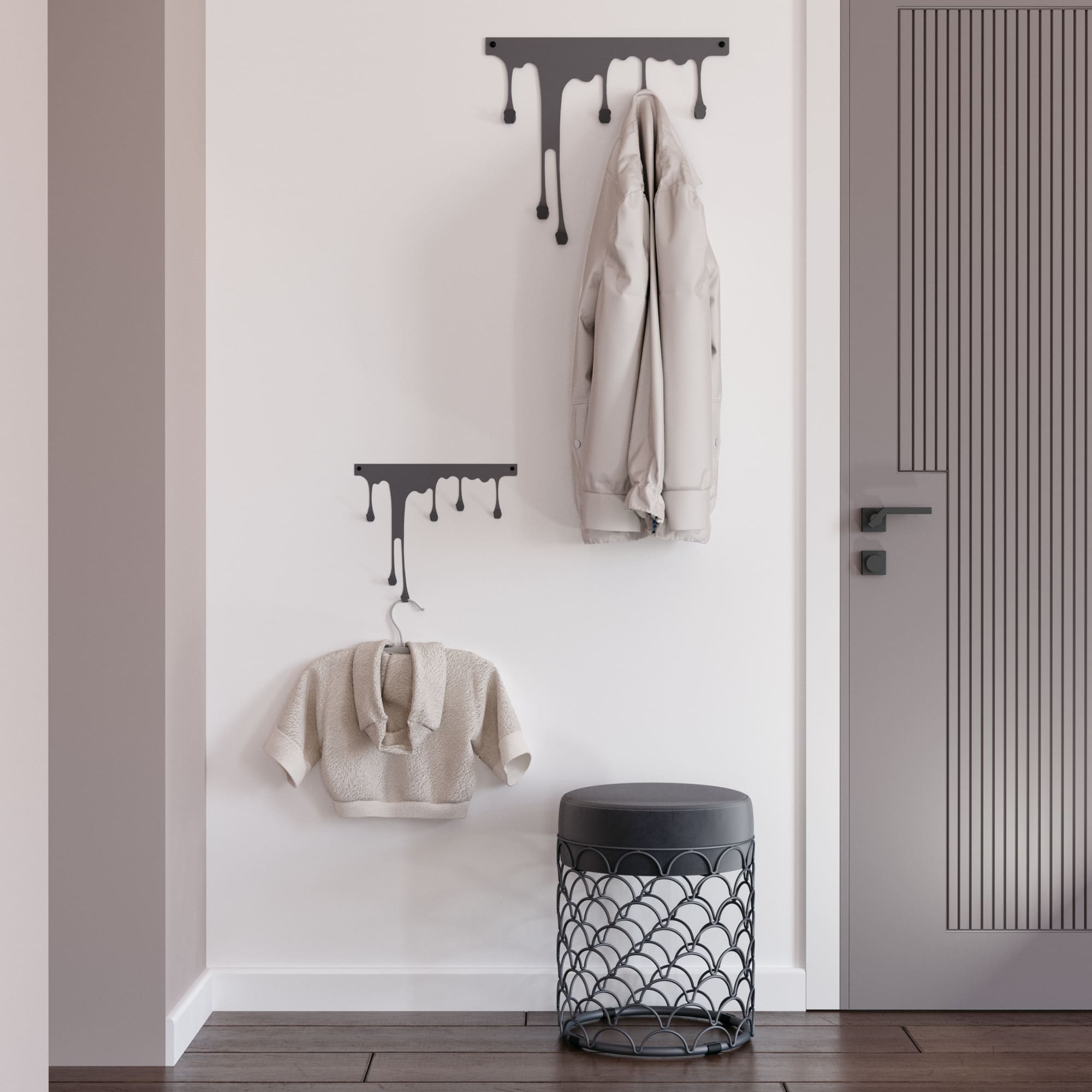 Форма стекающих капель краски задает особую динамику и художественность в интерьер. Плавно стекающие и утончающиеся капли смотрятся привлекательно и легко. Каждая капля является крючком. Вешалка может стать интересным акцентом в оформлении дизайна помещения.