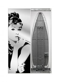Айрон Слим Принт (изображение на зеркале) – встроенная гладильная доска в компактном шкафчике с зеркальным фасадом с принтом (на ваш выбор: Чемоданы, Жук, Мост, Ретро, Скутер, Африка, Одри, Синий цветок, Желтый цветок, Куба, Сакура, Такси, Лондон или индивидуальное изображение) и размер 50х140 см.