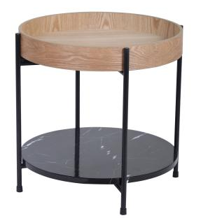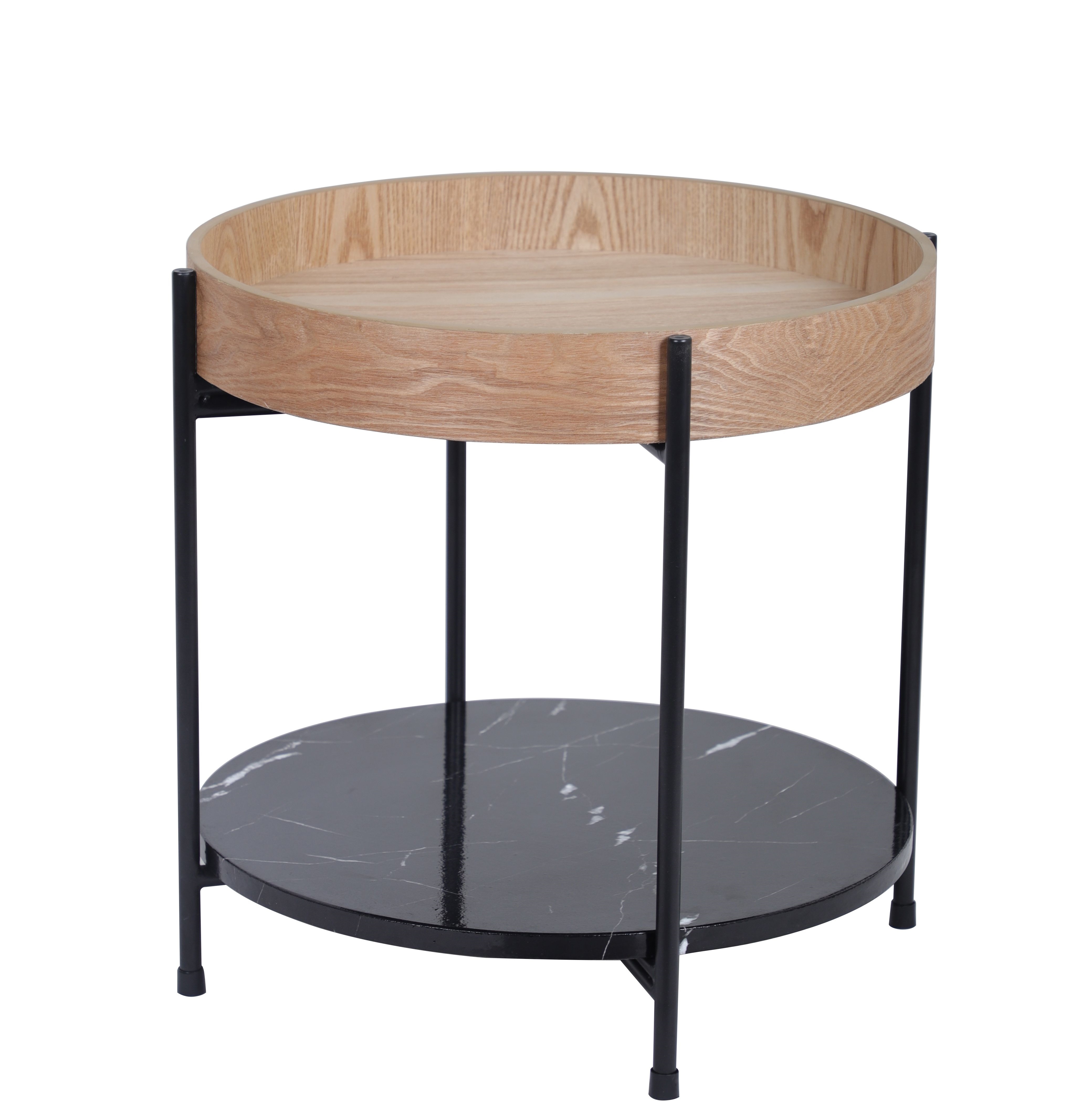 Круглый журнальный столик в современном минималистичном дизайне впишется в любой интерьер. Столешница выполнена из МДФ и покрыта шпоном из ясеня. Высокие бортики по краям предотвращают падение предметов со столика. Нижняя полка из МДФ с рисунком под мрамор идеально подойдет для хранения книг или журналов. Черный металлический каркас выдерживает нагрузку до 50 кг. Пластиковые подпятники в основании ножек защищают напольные покрытия от царапин и предотвращают скольжение.