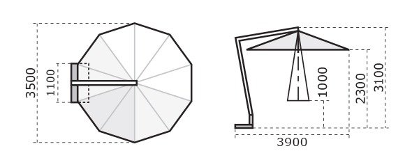 общая длина: 3900 мм (включая базу), общая ширина: 3500 мм.