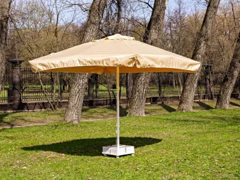 Конструкция зонта выполнена из алюминия, что гарантирует его прочность и долговечность. Ткань купола изготовлена из полиэстера плотностью 200 гр, а края выполнены без волана для более строгого и современного дизайна. Вес самого зонта без базы составляет 25 кг.